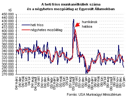 8,000 fővel csökkent az elmúlt héten a friss munkanélküli kérelmek száma az USA-ban a megelőző egy hetes periódushoz képest, így a szezonálisan kiigazított érték 290,000-re mérséklődött. Ez az elmúlt 11 hónap legalacsonyabb értéke, és a munkaerőpiaci kereslet mérsékelt erősödésére utal. Az értékelésnél figyelembe kell venni az igen enyhe időjárás pozitív hatását is. A trendszerű folyamatokat jelző 4 hetes mozgóátlag 6,500-zal 308,000-re csökkent, mely október óta a legalacsonyabb.