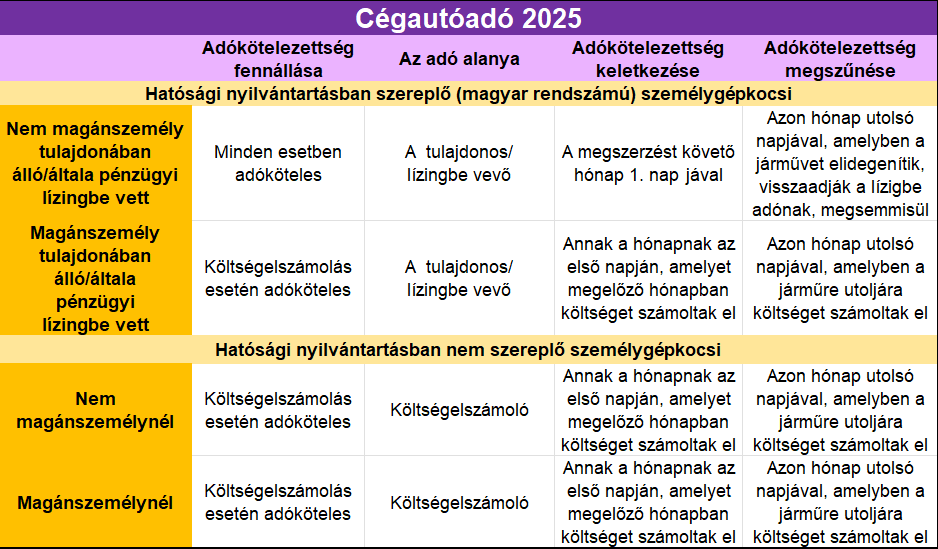Ahogy a fentiekben említettük, a gépjárműadó és a cégautóadó nem zárják ki egymást. A kétszeres adózás elkerülése céljából a negyedévre fizetendő cégautó adóból levonható – ugyanazon személygépkocsi esetében - a személygépkocsi után az adóalany terhére megállapított gépjárműadó. A gépjárműadó mértéke 2025-ben: