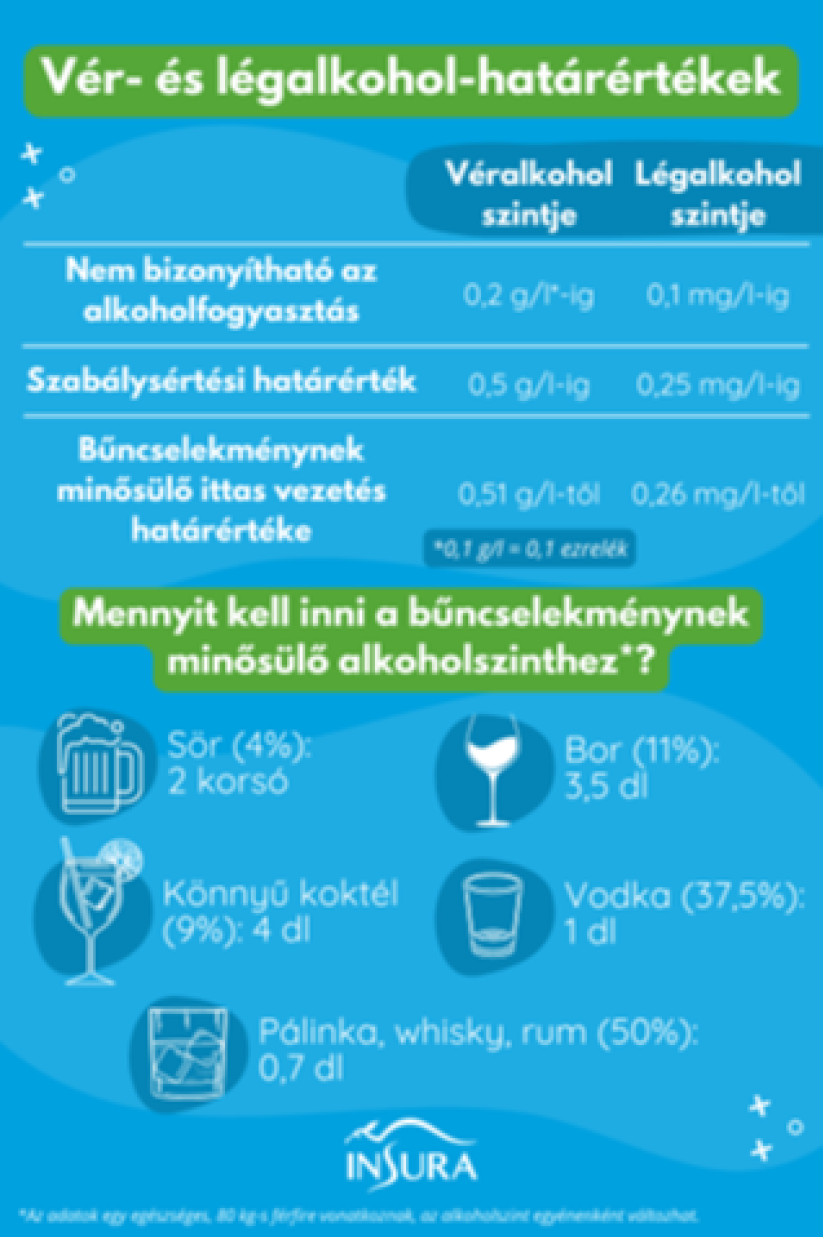 Az Insura.hu alábbi, tájékoztató jellegű infografikája italfajtánként mutatja be azokat a mennyiségeket, amelyek elfogyasztása után már jó eséllyel bűncselekményt követ el az, aki rövid időn belül járművet próbál meg vezetni.