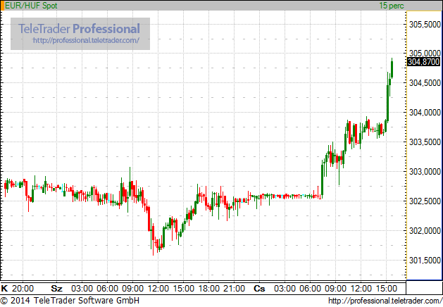 A váratlanul gyenge kínai makroadat miatt már eleve rosszul indult a forint napja, és ezt az sem változtatta meg, hogy meglepően jól alakultak a német és francia konjunktúraadatok délelőtt. A török líra hanyatlásának negatív hatásai az egész feltörekvő régióra átgyűrűztek, így délután átesett a kritikusan fontos 304-es szinten a forint az euróval szemben. A jegyzések 305 közelébe emelkedtek, azaz kilenchavi mélypontra zuhant a forint.