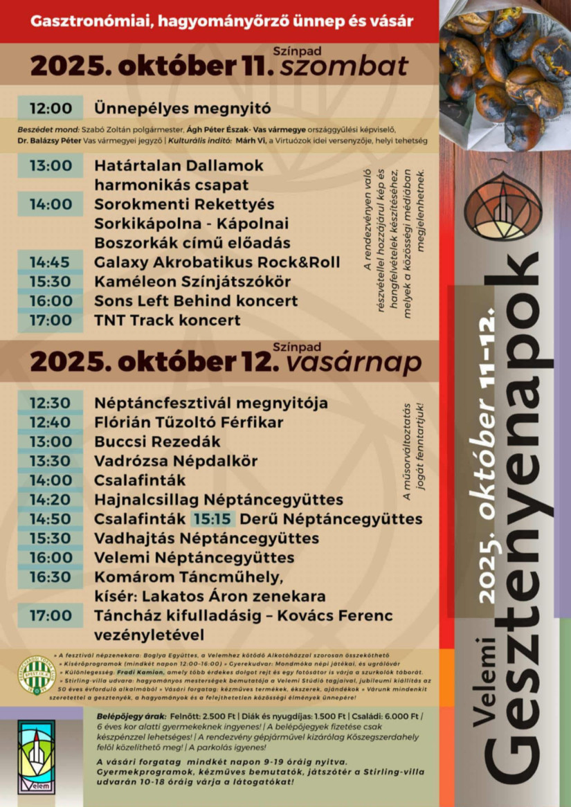 Október 11–12-én Velem főutcáját ismét sült gesztenye illata lengi be, miközben a település hatalmas vásártérré alakul. A színpadon helyi és környékbeli egyesületek, zenekarok lépnek fel, a könnyűzenei hangulatról pedig a TNT Track és a vasi Sons Left Behind gondoskodik. A fesztivál különlegessége a Fradi Kamion, amely minden korosztály számára látványos élményt nyújt.