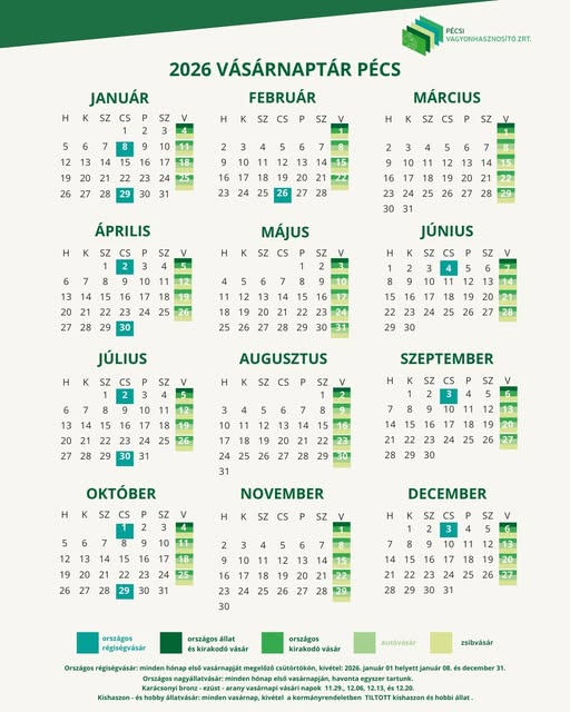 A Pécsi Vagyonhasznosító Zrt. bejegyzéséből ismerhetjük meg a 2026. évi vásárnaptárt, melyből látható, hogy idén is minden vasárnap tartanak országos kirakodóvásárt, autóvásárt és zsibvásárt függetlenül az ünnepnapoktól (március 15-e és november 1-je is vasárnapra esik idén, illetve húsvét és pünkösd vasárnapja is ünnepnapok). A karácsony és újév lehetne kivétel a korábbi évek tapasztalatai alapján, viszont 2026-ban egyik ünnepnap sem vasárnapra esik ezek közül.