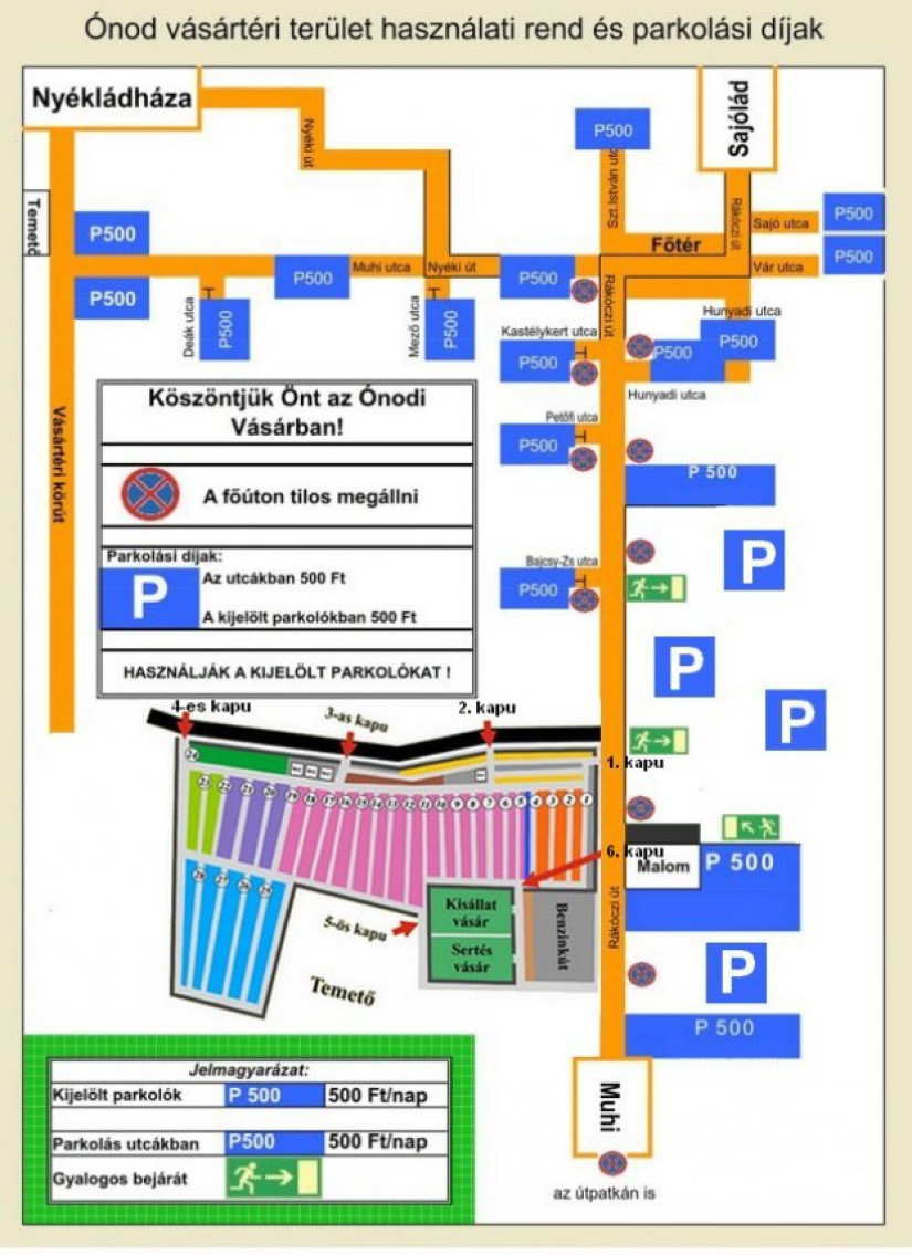 A vásártér mellett parkoló is található, utolsó friss információink szerint 500 forint volt a parkolás, de ez azóta változhatott. A község honlapján található részletes térképen pedig láthatók a különböző kapuk, a WC-k elhelyezkedése és a vásárterület árucsoportok szerinti felosztása is: