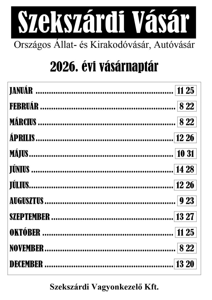 A szekszárdi vásár 2026-ban is minden hónap második és negyedik hétvégéjén lesz megtartva, a vásár időpontok már nyilvánosak. Egyetlen kivétel a december, amikor a negyedik hétvége december 27-re esne, ezért egy héttel korábban, december 20-án lesz az utolsó vásár. Idén ezek a dátumok nem ütköznek egyetlen ünneppel sem, bár van, amelyik hosszú hétvégére fog esni, illetve áprilisban az országgyűlési választások napján is lesz vásár Szekszárd területén.