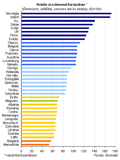 Összességében elmondható, hogy a teljes termékkör (élelmiszer, üdítőital, szeszes ital és dohányáruk) árszintjében 37 európai ország közül a 25. helyen állunk, ami a fejlettségünkkel összhangban áll. A felzárkózási folyamat során az árak közeledni fognak a nyugati országokban megfigyelhető szinthez, ám ez a folyamat még hosszú évekig fog tartani.