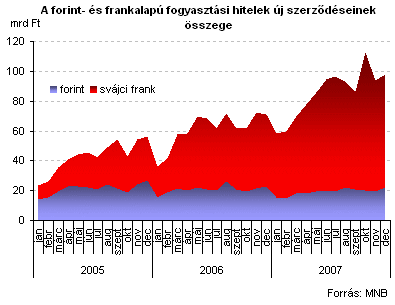A karácsonyi hitelláz elmaradása ellenére a 2007-es évvel kapcsolatban ki kell emelni, hogy kalkulációink szerint összesen 1030 milliárd forintot tett ki a kimondottan fogyasztási célú új hitelfelvétel Magyarországon (forint+deviza, a szabadfelhasználású jelzáloghiteleket itt vettük figyelembe) a 2006-os 740 milliárd forint után. Ez összességében erőteljes lakossági fogyasztássimítási magatartásra utal, azaz a megszorítások miatti reálbérvisszaesést hitelfelvételek árán is igyekszik ellensúlyozni a lakosság, hogy fenntarthassa korábbi fogyasztási szintjét. Erre a folyamatra már korábban is felhívtuk a figyelmet: