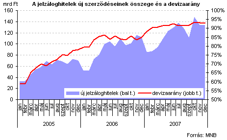 A novemberi 134 milliárd forinton stagnált decemberben az új jelzáloghitel-szerződések összege, amely a frankalapú konstrukciók (szabadfelhasználású és lakáscélú) iránti stabil kereslettel függ össze. Emiatt az ilyen típusú új kölcsönökön belüli devizaarány is 93%-on maradt. A decemberi adatok ismeretében elmondható, hogy 2007-ben a magyar háztartások 1420 milliárd forintnyi új jelzáloghitelt vettek fel, 30%-kal többet, mint 2006-ban.