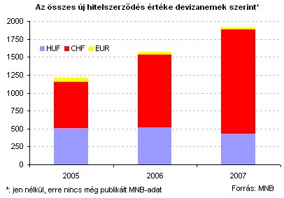 2007-ben a forintalapú lakossági új hitelszerződések 430 milliárdot, a devizaalapú konstrukciók a bevezetőben is jelzett 1480 milliárd forintot (5.9 mrd EUR-t) tettek ki, azaz a háztartások az új kölcsönök bő háromnegyedét devizaalapon igényelték. Amint az alábbi ábra jelzi, miközben erőteljes bővülést mutat a devizaalapú hitelezés Magyarországon, addig a forintalapú szépen apad. (Amennyiben a devizahitelek esetében nem az új hitelszerződések, hanem az állomány változását nézzük - amely a törlesztések és a refinanszírozás hatását is figyelembe veszi, de a számításaink szerint elhanyagolható mértékű árfolyamhatást nem tartalmazza -, akkor 1230 milliárd forintos, azaz kb. 4.8 milliárd eurónyi bővülés következett be számításaink szerint.)