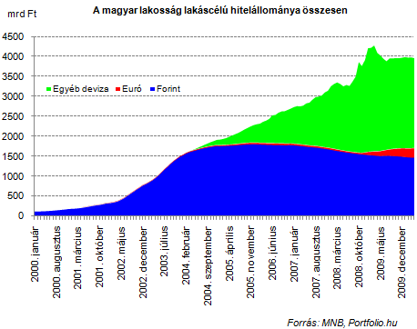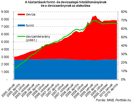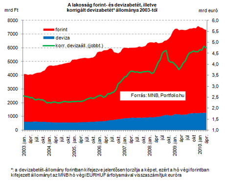 Annak fényében, amit az óriási devizahitel-állomány lassú leépüléséről a fentiekben leírtunk, nem meglepő, hogy a lakosság hiteállománya az elmúlt egy évben gyakorlatilag stagnált, értéke áprilisban 7846 milliárd forint volt. Ebből 3964.6 milliárd forint volt lakáshitel, és 66%-a volt devizahitel.