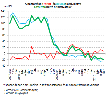 Az MNB (szezonálisan nem igazított) adatai alapján áprilisban ismét nettó devizahitel-törlesztő volt a magyar lakosság. Ez azt jelenti, hogy devizában több hitelt törlesztettek a háztartások, mint amennyit felvettek, s a különbség 28.6 milliárd forint volt előbbi javára. Ez a szám soha nem volt még ekkora, és az euróhitelek további visszaszorulását feltételezve (a svájci frankról nem is beszélve) nem is fog csökkenni. A forinthiteleknél viszont más a helyzet: 8.1 milliárd forint értékben nettó hitelfelvevő volt a lakosság, ami elmarad ugyan az előző havi 13 milliárd forintos értéktől, az új hitelfelvételek már a forinthitelek népszerűség-növekedését mutatják.