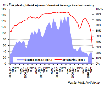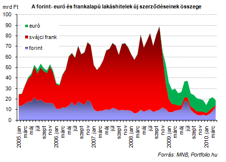 Az alábbi ábrán jól látható, egy évtized alatt milyen fontos szerepre tett szert a hitelezés a lakáspiaci finanszírozásban. A devizahitelezés 2004-2005-ben nyert "polgárjogot" és lett pár év múlva a lakásfinanszírozás első számú formája. Akármilyen szándékkal is lép fel az új kormány e hatalmas, április végén 2255 milliárd forintos állomány árfolyamkockázatainak mérséklése érdekében, egyértelmű, hogy egy ekkora állomány mégoly tervszerű forintra váltását sem viselné el a pénzügyi rendszer. Mivel óriási volumenről van szó, a forinthitelek térnyerése sem oldja meg az árfolyamkockázatból fakadó problémát, hiszen mint fent is láttuk, az új forinthitelek mennyisége messze elmarad a múltban kihelyezett devizahitelek havonta kihelyezett volumenétől.