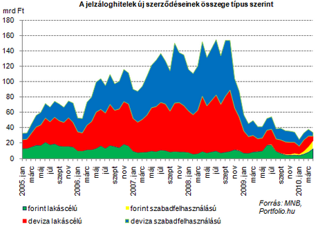 Ami pedig az abszolút számokat illeti: 13 milliárd forintnyi új lakáshitelt és 11 milliárd forintnyi szabad felhasználású jelzáloghitelt helyeztek ki a bankok áprilisban hazai fizetőeszközben. A 13 milliárd nem kiugró adat: tavaly a lakástámogatási rendszer megszűnése előtt már volt példa nagyobb összegű kihelyezésre is, sőt, a válság előtti időkben sem lett volna szokatlan. Fontos kiemelni: akkor volt hasonló ez az összeg, amikor négyszer-ötször ennyi devizahitelt vettek fel a magyar háztartások, és sokaknak eszükbe sem jutott, hogy forintban vegyenek fel hitelt. A szabad felhasználású jelzáloghitelek esetében már más a kép: a korábban mostohagyereknek számító forint mára egyértelmű favorittá vált, így ennek köszönhető, hogy összességében a forinthitel csaknem ötéves csúcsot döntött.
