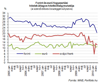 Míg a lakáshitelekben mind a forint-, mind az euróhitelek hitelköltség-mutatója csökkent, a fogyasztási hitelekben csak a forinthiteleknél figyelhettük ezt meg áprilisban. A forinthitelek hitelköltség-mutatója 20% körül jár, míg a devizahiteleké 11-12% közelében.