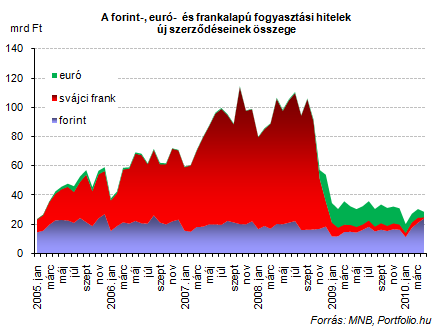 Fogyasztási hitelt azonban alig kínálnak a bankok devizában, így eleve kis volumenben voltak képesek ilyet felvenni az ügyfelek: euróban 3.9, svájci frankban pedig 1.2 milliárd forint összegben, szemben a forint 23.7 milliárdjával.