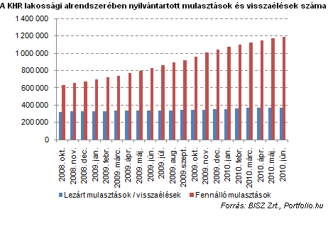 A válság kezdetén, 2008 októberében még "csak" 633 ezer volt a fennálló lakossági mulasztások száma a rendszerben, ám ez idén június végére 1 189 ezer fölé nőtt. Bár a lakásárverezések jelenleg is szünetelnek, tavaly év végén hatvanezer jelzáloghitel esetében állt fenn 90 napon túli tartozás, és ez a szám azóta csak tovább nőhetett. A PSZÁF ezzel kapcsolatos statisztikái várhatóan augusztusban jelennek meg, becsléseink szerint csaknem minden tizedik jelzáloghiteles esett mára legalább 90 napos késedelembe. A KHR rendszerben a mulasztás megszűnik, ha az ügyfél teljes tartozása rendeződik (a hátralék kiegyenlítésével, fedezet, kezes igénybe vételével, vagy akár a szerződés átütemezésével), a lezárt mulasztások azonban az üzleti lekérdezésekben a lezárást követően még további öt évig láthatók. Utóbbiak száma a 2008. októberi 324 ezerről mára 373 ezerre nőtt.