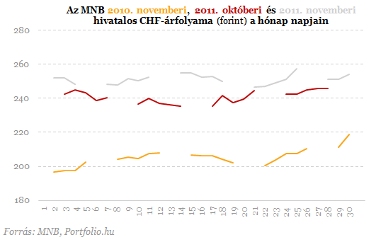 novemberben az átlagos havi frankárfolyam (MNB hivatalos), szemben az