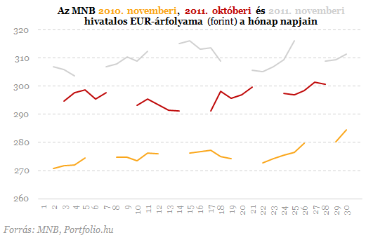 euró havi átlagárfolyama eközben novemberben 309,8 forintra nőtt. Mindez