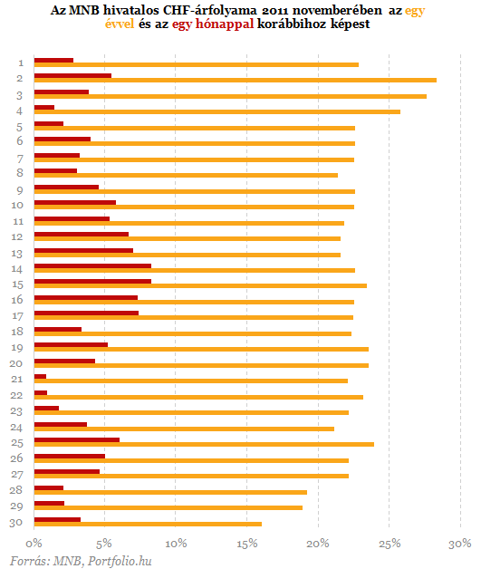 Feltételezve, de meg nem engedve, hogy a törlesztések egyenletesen alakulnak a hónap során, novemberben az egy hónappal korábbihoz képest 4,3%-kal magasabb, az egy évvel korábbihoz képest pedig 22,5%-kal magasabb volt egy átlagos törlesztőrészlet csak a frankárfolyam mozgása miatt. Igaz, utóbbi kicsit felfelé torzít, hiszen ekkor még nem volt hatályban az említett rendelet, így korábban általában néhány forinttal magasabb árfolyamon törlesztettek a lakáshitelesek. Ami az euróhiteleseket illeti, csak az árfolyammozgásokat figyelembe véve az egy évvel korábbihoz képest átlagosan 12,3%-kal, az egy hónappal korábbihoz képest 4,5%-kal voltak magasabbak a törlesztőrészletek.