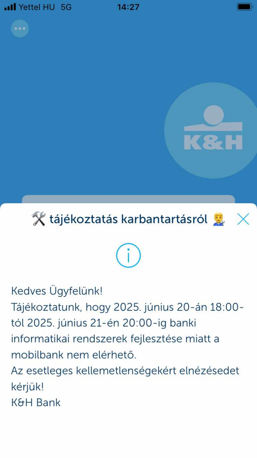 Mint a rövidke tájékoztató üzenetben írják, a banki informatikai rendszereket fejlesztik majd, és ezért nem lesz elérhető a K&H mobilbankja. A pénzintézet termézsetesen elnézést kér az ügyfelektől az okozott kellemetlenségek miatt.