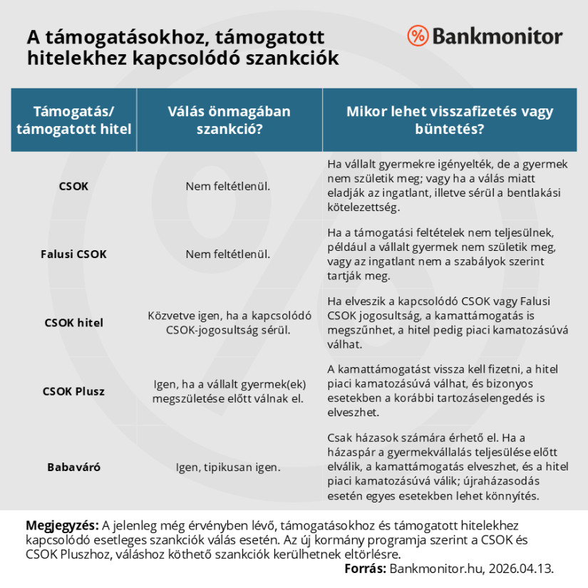 A TISZA Párt programja szerint válás esetén nem kellene visszafizetni a CSOK-ot és a CSOK Pluszhoz kapcsolódó kedvezményeket, ami érdemi fordulatot jelentene a mai szabályokhoz képest. Jelenleg ugyanis a válás nemcsak érzelmi és jogi törést okozhat, hanem komoly pénzügyi veszteséget is, mert bizonyos esetekben az állami támogatás, a kamattámogatás, sőt más kedvezmények is visszakövetelhetők. A könnyítés hatalmas segítség lenne, de egy fontos elem, a Babaváró hitel kimaradt az említett támogatások közül.