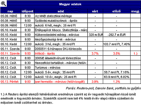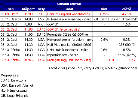 Az előttünk álló héten a megszokottnál kissé kevesebb fontos makroadat lát napvilágot: a magyar vonatkozású hírek közül kiemelkedik a szerdai inflációs adat (április), illetve a pénteken megjelenő ipari termelési adatok (felülvizsgált márciusi adatok). A régiós makroadatok körül ki kell emelni a hétfői cseh és a szerdai szlovák áprilisi inflációs adatokat. A nemzetközi piacok esetében különösen fontos a mai Bank of England kamatdöntés, a csütörtöki német, illetve euró-zónás GDP-adatok (első negyedév), valamint a pénteken napvilágot látó Michigan Egyetem által számított fogyasztói bizalmi index (május).