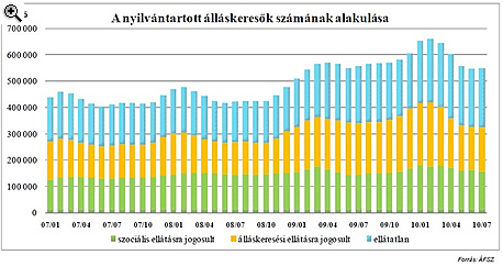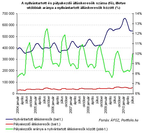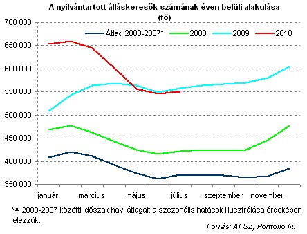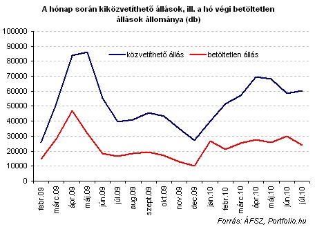 Szintén nem ad nagy nyugalomra okot az álláskeresők népes táborának az, hogy a július végén kiközvetíthető állások száma (60 ezer) szintén mintegy 50%-kal haladta meg az egy évvel ezelőttit, mindenesetre a munkaerőpiaci kereslet élénkülését jelzi tavalyhoz képest.