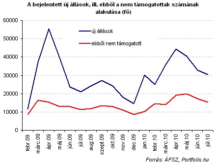 A jóval több mint félmillió fős álláskereső tábor számára csak minimálisan jó hír, hogy az ÁFSZ adatai szerint júliusban az újonnan bejelentett álláshelyek száma (30 ezer 500) közel 50%-kal volt több, mint egy éve. Az újonnan bejelentett állásoknak éppen a fele volt államilag nem támogatott jellegű.