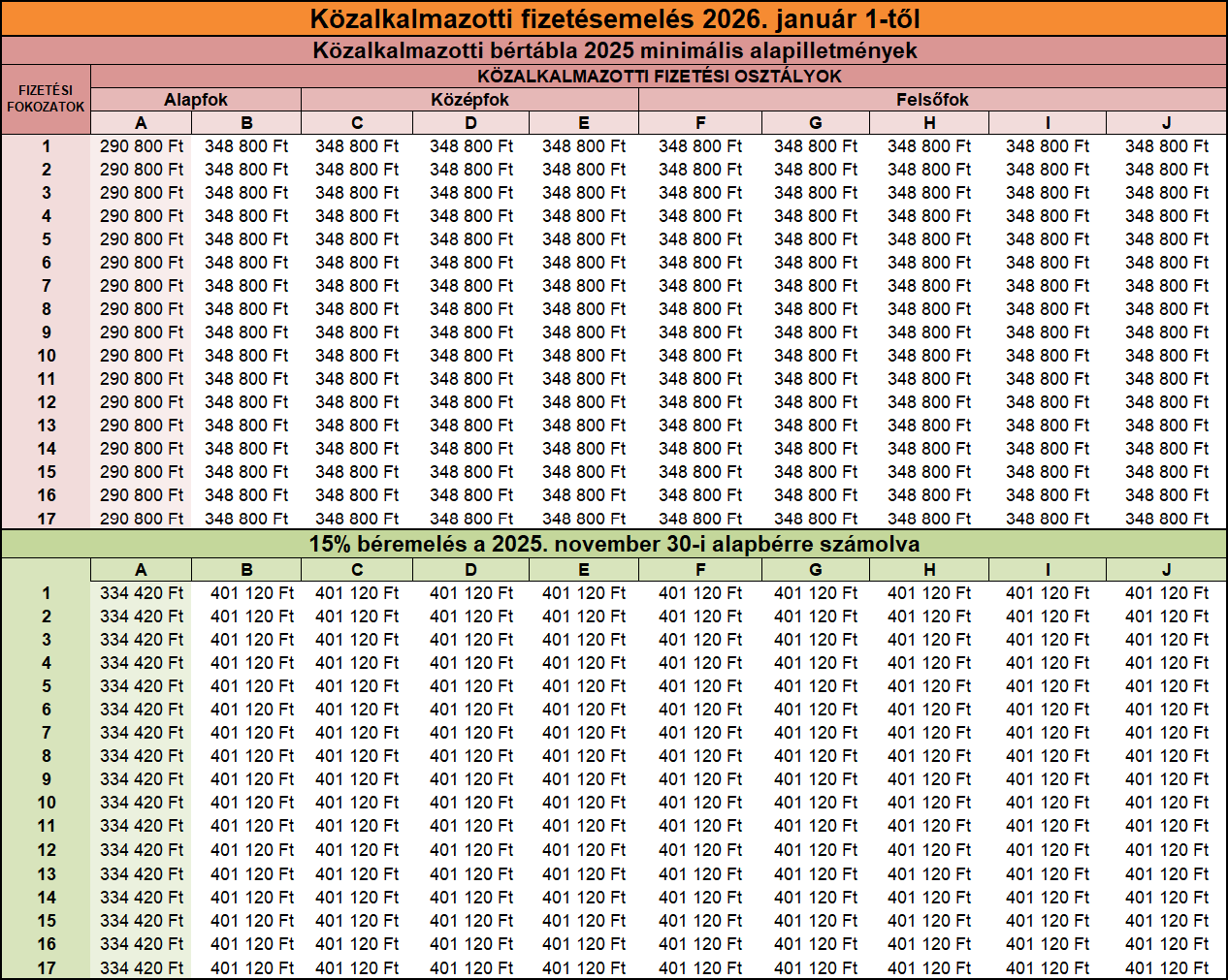 A bértábla a következőképp nézne ki, ha kizárólag a közalkalmazotti törvényben meghatározott bruttó alapilletményeket vennénk alapul (ezt a bértáblát írja felül a későbbiekben részletezett általános közalkalmazotti béremelés):