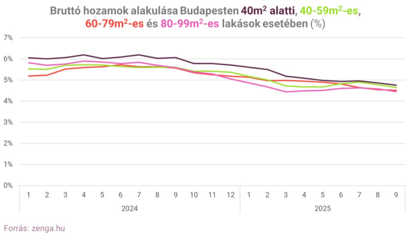 Mivel idén mérséklődött az elmúlt években a bérleti díjak emelkedése, a hozamok így minden méretkategóriában csökkentek. “Vagyis a kiadásból származó hozam most kisebb, mint egy éve, jóllehet az elmúlt egy évben ezt bőven kompenzálta a tulajdonosok számára az áremelkedés” - hívta fel a figyelmet Futó Péter.