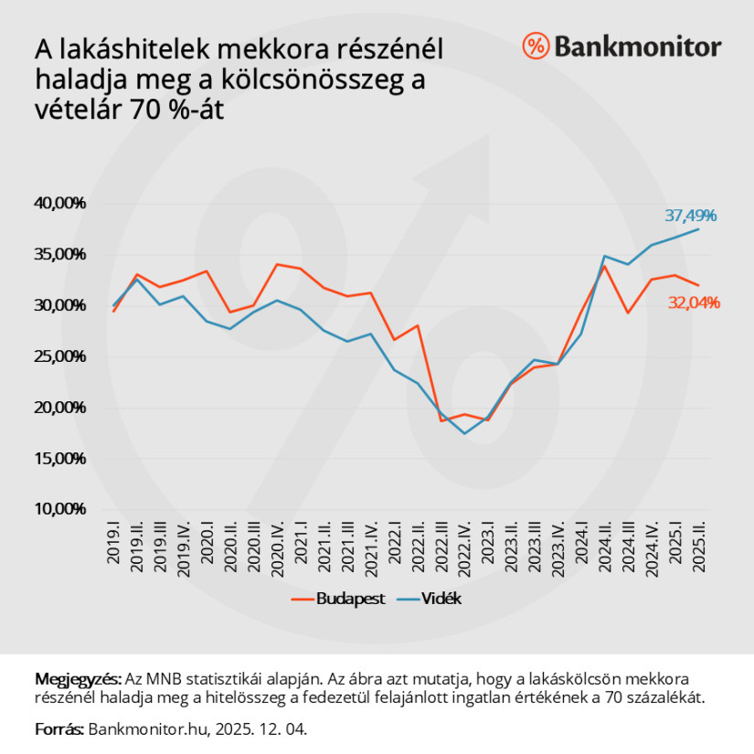 Budapesten a 2025 II. negyedévben kibocsátott lakáshitelek átlagosan a fedezeti ingatlan forgalmi értékének a 49 százalékát tették ki. Ugyanez az arány vidéken 52%. Nagyon leegyszerűsítve egy lakáshitel esetében – ahol egy fedezet van és reális áron veszik meg a lakást - a vételárnak durván a felét finanszírozzák kölcsönből az adósok.