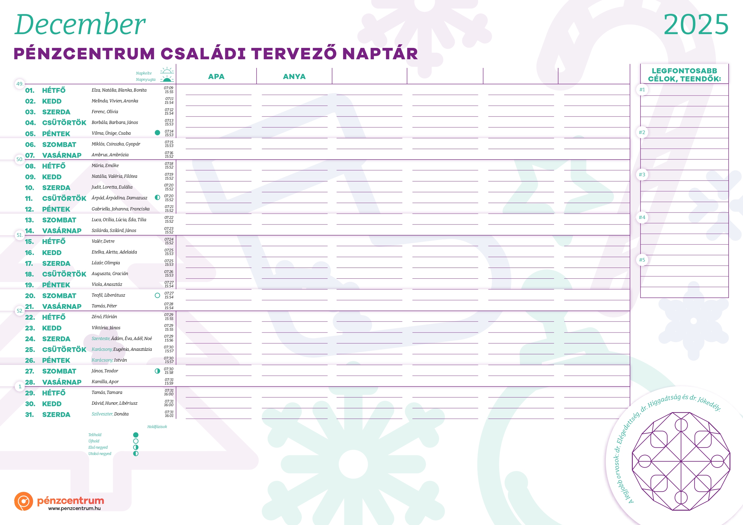 Ahogy közeledik az év vége, a legtöbb családban egyre nagyobb a sürgés-forgás, pedig a karácsony előtti heteknek nem kellene a káoszról, kapkodásról és felesleges kiadásokról szólniuk. Egy jól összeállított családi tervező naptár segít átlátni a hetet, a hónapot, a feladatokat és a pénzügyeket, így az ünnepi készülődés is sokkal tudatosabbá, nyugodtabbá válik. Akár papír alapút választunk, akár digitális megoldást használunk, a lényeg változatlan: ha előre megtervezzük a teendőket és a költségkeretet, a december már nem a rohanásról, hanem a meghitt pillanatokról szólhat.