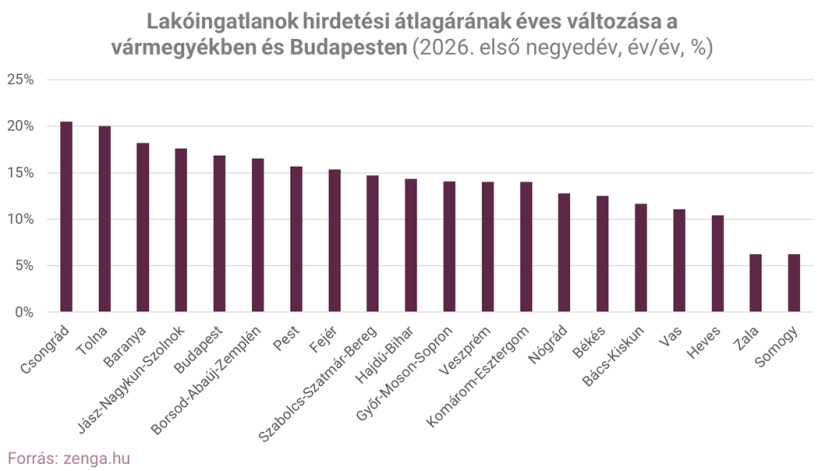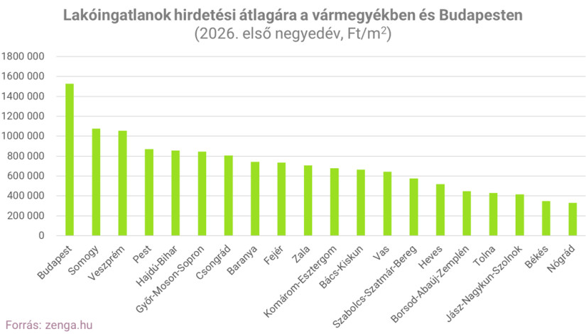 Az árakat tekintve Budapest továbbra is kiemelkedik, a fővárosban az átlagos hirdetési négyzetméterár 1,526 millió forint 2026 első negyedévének adatai szerint. Ezt Somogy és Veszprém vármegye követi 1,077 millió, illetve 1,056 millió forintos átlaggal, míg a lista végén Nógrád áll 329 ezer forinttal.
