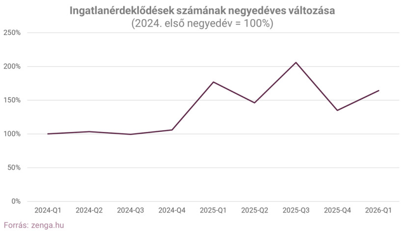 2025 utolsó negyedévéhez képest a kereslet erősödése látható. „Az idei első három hónapban 22 százalékkal volt több ingatlanérdeklődés (eladónak történő üzenetküldés vagy telefonszámfelfedés), mint a tavalyi utolsó negyedévben, az egy évvel ezelőttitől viszont 7 százalékkal elmaradnak a számok” – mondta Futó Péter.