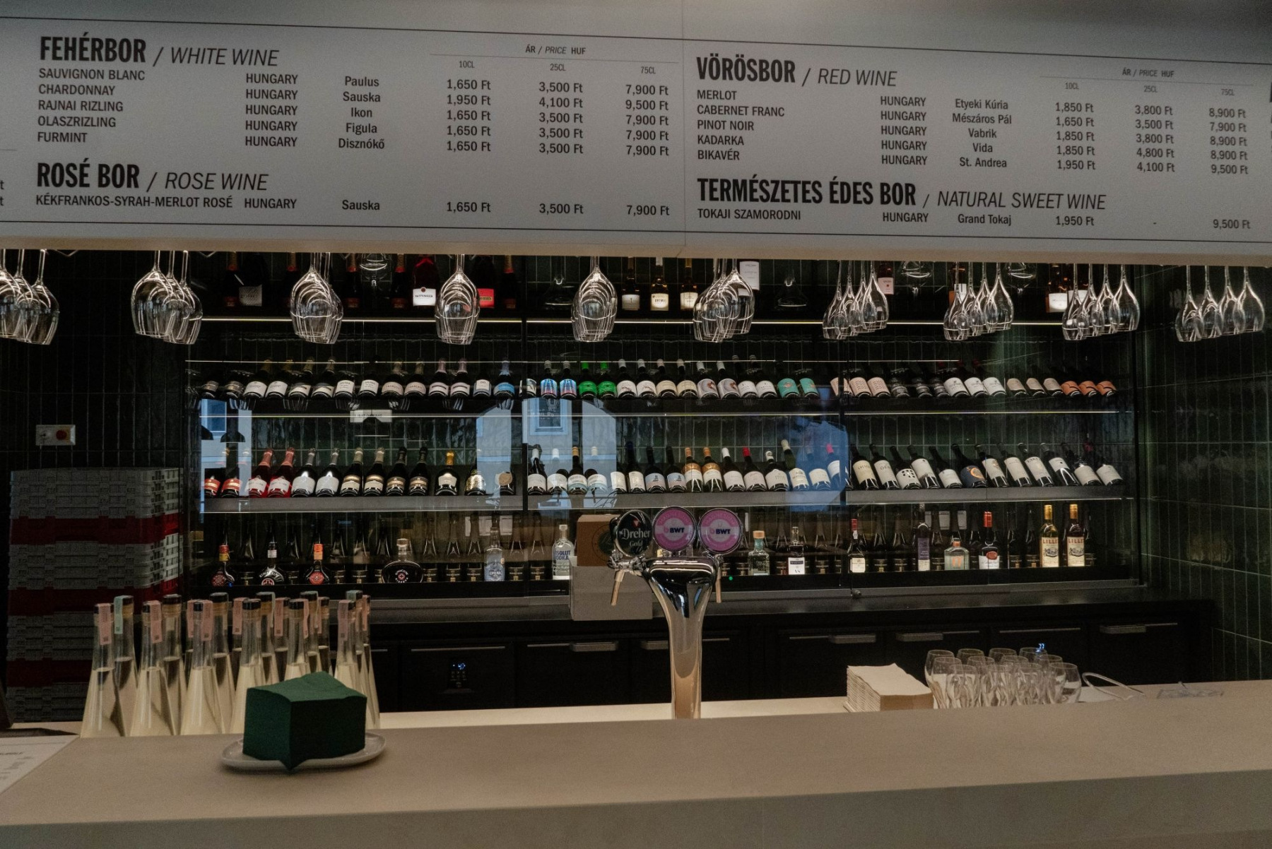 - A Time Out Market Brut Tokaj decije 1 950 Ft, üvegára 9 500 Ft; francia champagne decije 4 950 Ft.