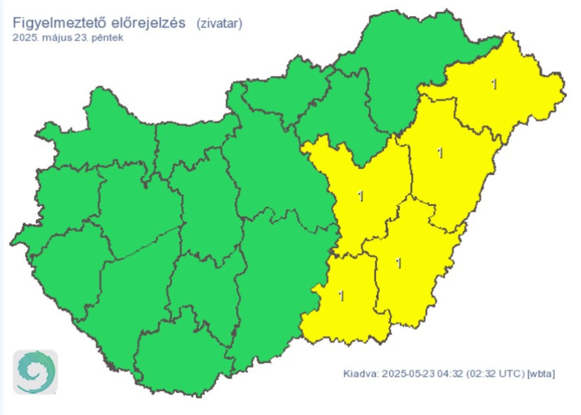 Ma a késő délelőtti óráktól elsősorban a Tiszántúlon alakulhatnak ki zivatarok, melyeket viharos széllökés (60-80 km/h), intenzív csapadék (15-25 mm), és jégeső (1-2 cm) kísérhet. Emellett délkeleten egy-egy heves zivatar kialakulására sem kizárt, melyekhez erősen viharos széllökés (> 90 km/h), és jégeső (~2 cm) társulhat -írja a met.hu.
