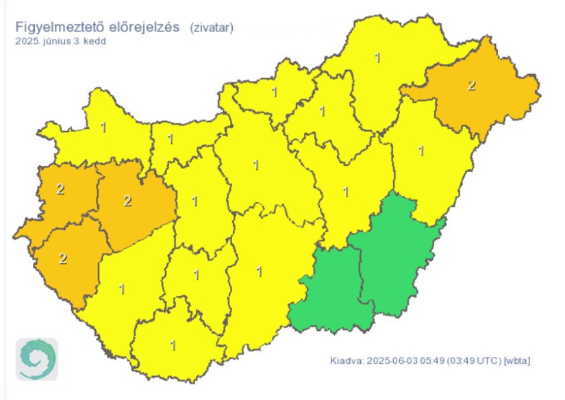 Vas, Zala, Veszprém és Szabolcs-Szatmár-Bereg megyére narancssárga veszélyjelzést adtak ki lehetséges zivatarok miatt, az ország többi részére Békés és Csongrád-Csanád kivételével pedig citromsárga figyelmeztetés van érvényben.