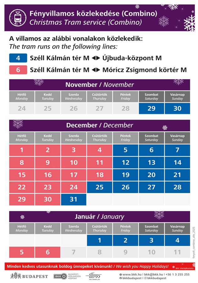 A fényvillamos menetrend ismerete segíthet abban, hogy nehogy elszalasszuk az adventi látványosságot. A hagyományos UV-típusú karácsonyi fényvillamos 2025. november 28. és 2026. január 6. között, mindennap délután 4 órától késő estig, kivéve december 24-én és 31-én. Ez a típusú villamos leginkább a 2-es villamos útvonaláról ismert, de számos más vonalon is felbukkannak majd csillamosok: