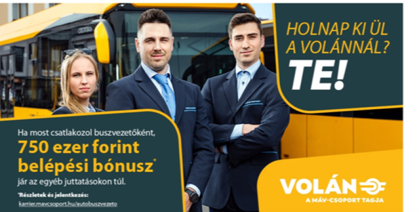 A MÁV–Volán csoport új toborzókampánya látványos üzenettel próbálja megszólítani a munkaerőpiacot: aki most buszvezetőként csatlakozik, 750 ezer forintos belépési bónuszt kap az egyéb juttatásokon felül.