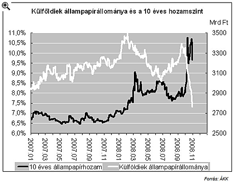 Érdekes kiemelni, hogy a válságjelek az állam finanszírozásánál nem a devizaadósságnál, hanem a forintadósságnál mutatkoztak először (az állampapírállomány mintegy fele a külföldiek kezén van. A részvényeknél ez az arány 80%.). A külföldiek a forintállampapírok mintegy 30%-át birtokolták, az állomány teljes nagysága 2008 évi csúcspontján 3500 milliárd forintot (14 milliárd dollárt) tett ki. Szeptembertől a globális válság éleződése - a kockázatvállalási hajlandóság csökkenésén és a likviditási feszültségek erősödésén keresztül - a külföldiek forint állampapír-eladásaihoz vezettek. A meglóduló másodpiaci eladások 3-6%pontos hozamemelkedést hoztak, mely viszont a nagy hazai befektetőket is elrettentette az állam finanszírozásától, akik további kötvényáreséstől tartottak. (Kivételt csupán a lakossági szegmens jelentett, melyet a magas hozamszintek vonzottak.) Mindez végül az elsődleges piac befagyásához is elvezetett.