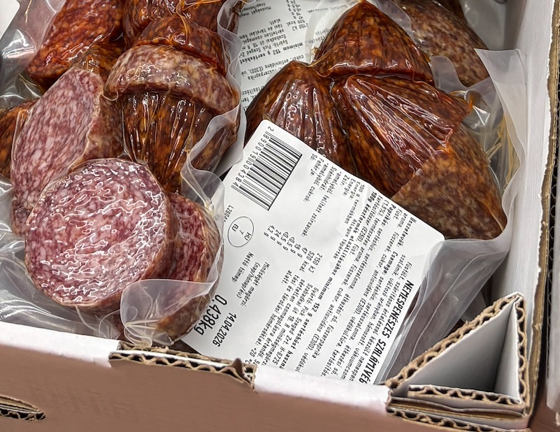 Az összecsomagolt, lefóliázott szalámivégek talán nem a legszebb látványt nyújtják így ölesztve, az áruk már annál csábítóbb: 3199 forint/kg. Tavalyelőtt februárban szintén kaptunk egy képet egy olvasónktól, amelyen a CBA Príma üzletláncnál 5650 forintért lehet kapni kilóját. Ehhez képest a 3199 forint valóban szuper ár!